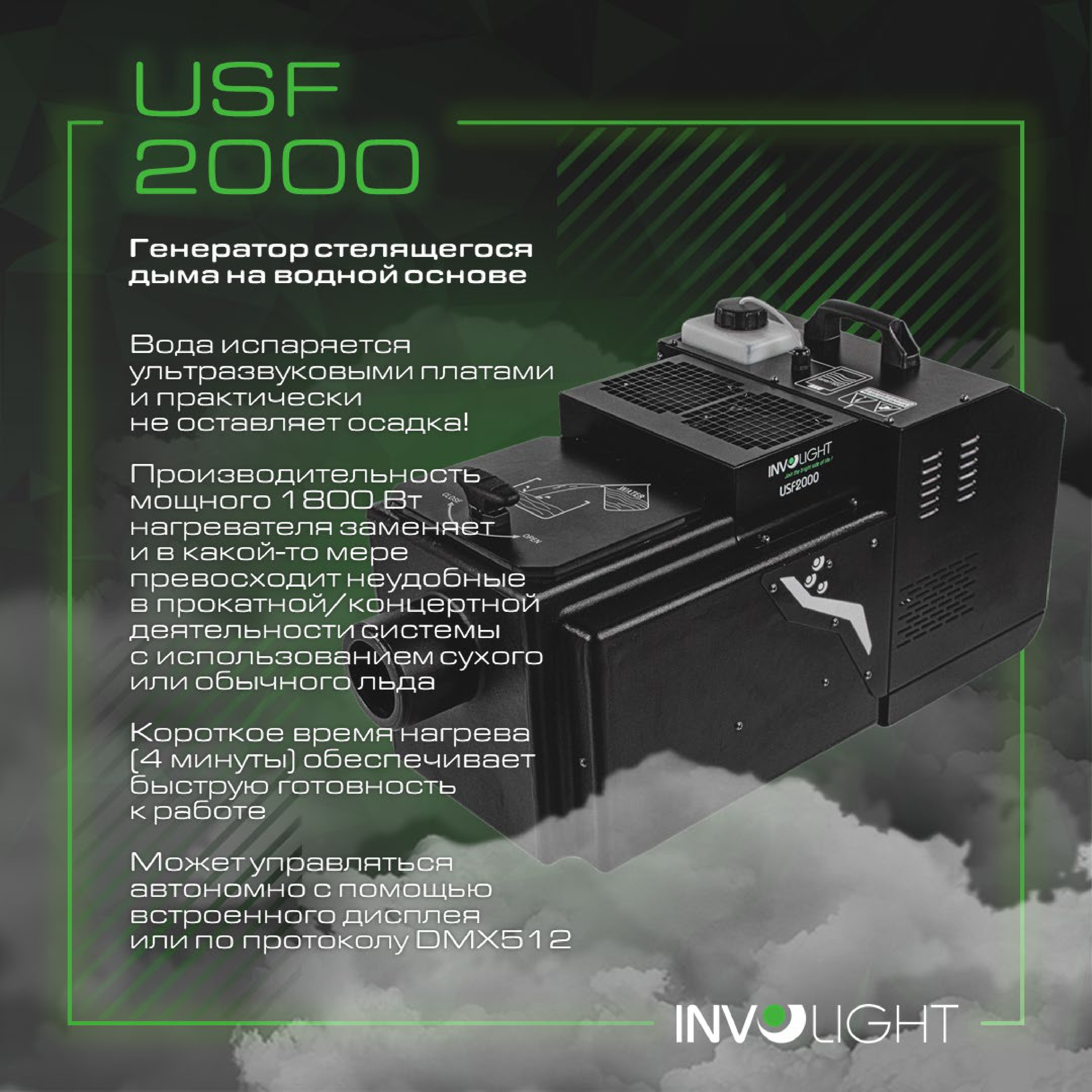 INVOLIGHT USF2000- это профессиональный генератор для создание плотного стелящегося дыма. Благодаря установленным ультразвуковым платам, разработанным с специальной технологией, испаряемая вода, действуя для дополнительной плотности дыма практически не оставляет осадка, и в комплексе с мощным 1800Вт нагревателем имеет максимальную производительность для достижения эффекта плотного стелящегося дыма заменяя и в какой-то мере превосходя крайне неудобную в прокатной, или концертной деятельности системе с использованием сухого или обычного льда. Короткое время нагрева (4 минуты) обеспечивает быструю готовность к работе. INVOLIGHT USF2000 может управляться автономно с помощью встроенного дисплея или по протоколу DMX512.