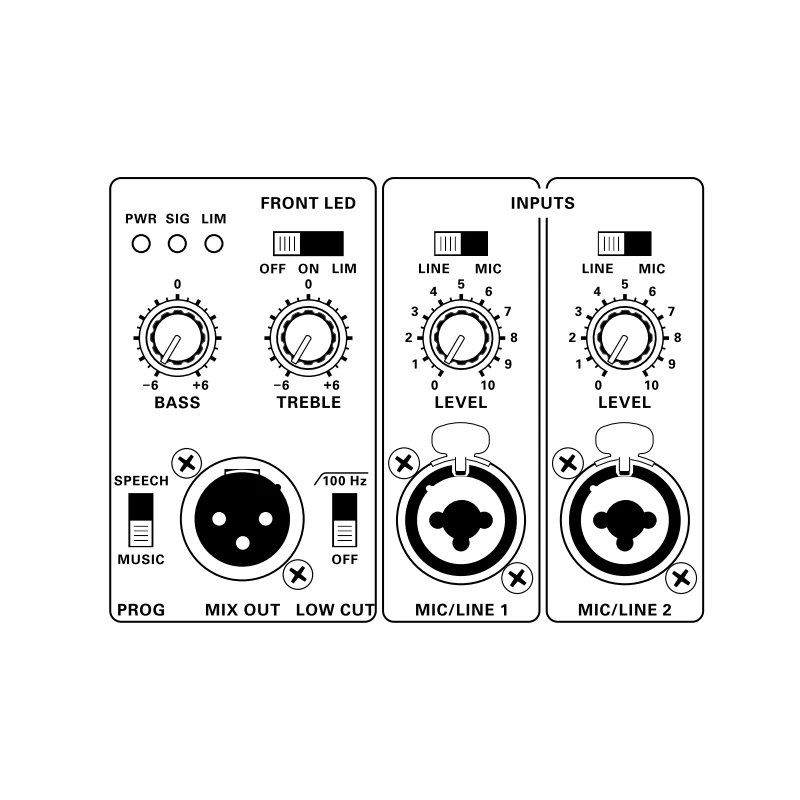 Портативная активная двухполосная акустическая система. Состоящая из 10' вуфера и 1' компрессионного драйвера. При своих компактных размерах, акустическая система, развивает мощность 600W и звуковое давление в 126dB (peak) благодаря новому усилителю класса D. На усилителе два независимых входа (микрофонный и линейный), двух полосный эквалайзер. Частотный диапазон акустической системы: 55Hz - 18kHz ±3dB. Система имеет 6 точек подвеса M10 и в нижней части корпуса 'стакан' для установки акустической системы на стойку. Трапециевидный корпус изготовлен из полипропилена высокой плотности, Симметричные 43 ` углы позволяют использовать акустическую систему в качестве напольного монитора. Встроенные ручки на верхней панели, предназначены для легкого подъема и переноски. я эмблема может работать в одном из трех возможных режимов: постоянно включенная; постоянно выключена или указать на ограничения встроенного лимитера. Размер акустической системы: 522мм х 329мм х 294 мм. Вес нетто 13.3кг.