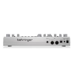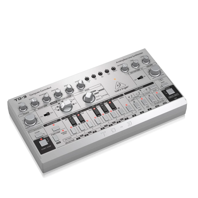 Behringer TD-3 - басовый синтезатор, клон легендарного Roland TB-303. В отличие от именитого предшественника, синтезатор имеет встроенную схему дисторшна, основанную на педали Boss DS-1, и поддержку MIDI/USB. Синтезатор полностью воссоздает схему VCO, VCF и VCA оригинального устройства и оснащен 16-ступенчатым секвенсором. Доступно 2 формы звуковой волны осцилятора: пила и прямоугольник, а также низкочастотный фильтр, регулирующий cut-off, резонанс, время затухания и атаку. Также синтезатор имеет арпеджиатор с встроенными паттернами и 16-шаговый 7-трековый секвенсор с 250 пользовательскими шаблонами. При комбинировании в цепь нескольких синтезаторов можно достичь полифонии до 16 голосов. Для удобства управления доступны 11 ручек управления и 28 переключателей. На фронтальной панели доступны 4 разъема для патчинга и CV/Gate, а также разъем для наушников. На задней панели находятся разъемы MIDI In/Out и USB с возможностью выбора канала MIDI, а также основной аудио-выход, кнопка включения и разъем для питания.