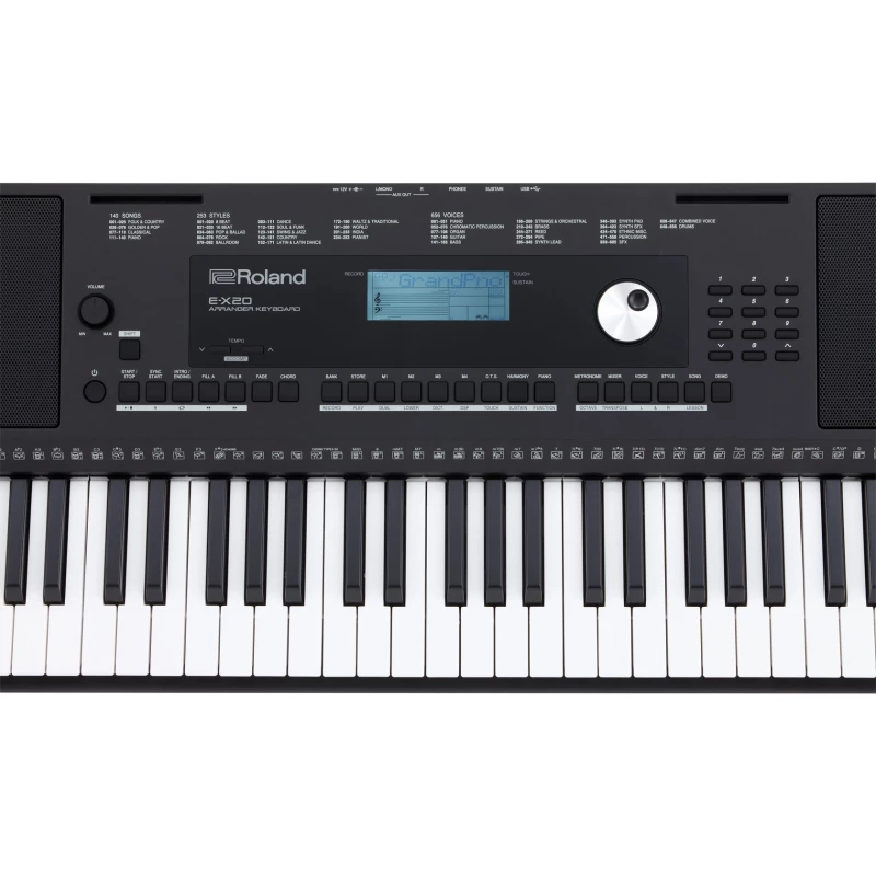 Roland E-X20 — портативный любительский синтезатор на 61 клавишу. Среди 656 тембров есть и стандартные тембры фортепиано, и различные пресеты для поп-музыки, рока, джаза и электроники. Встроенная функция аранжировки позволяет играть под полное музыкальное сопровождение и объединяет 253 стиля. Клавиатуру можно разделить на зоны и играть в две руки. Звук можно обработать ревербом и хорусом. Клавиатура весит всего пять килограммов, работает от батареек. В корпус встроены динамики. Особенности E-X20: Функция аранжировки помогает развивать технику и навык игры с ансамблем; Множество музыкальных стилей и звуков; Легкий корпус, портативный формат, встроенные динамики и возможность работы от батареек.